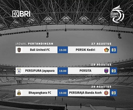 Sedangkan di laga kedua, lanjut Sudjarno, akan disajikan Persipura vs Persita Tangerang di Stadion Pekansari Bogor, Sabtu (28/8) pukul 19.00. Dan Laga ketiga Bhayangkara FC vs Persiraja Banda Aceh di Stadion Indomilk Arena, Tangerang, Minggu (29/8) pukul 19.00 WIB