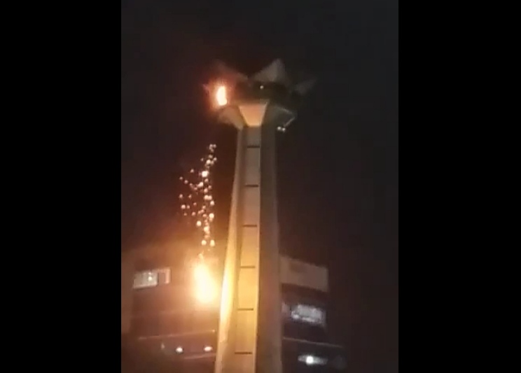 Menurut Aceng, saksi mata yang merupakan penjaga parkir, mengatakan api terlihat menyala dan membesar di bagian jam digital yang berada di puncak menara.