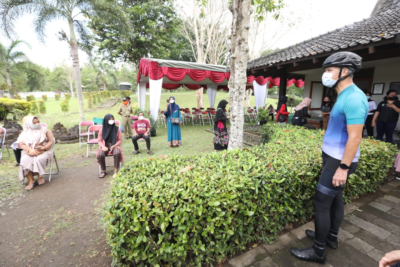 Sambil gowes pagi dari Jogjakarta, Ganjar memantau vaksinasi massal yang digelar di beberapa titik di Magelang, di antaranya vaksinasi di kawasan Borobudur. Kegiatan vaksinasi itu disambut antusias masyarakat. Mereka rela antre dengan tertib sejak pagi untuk mendapat jatah vaksinasi.