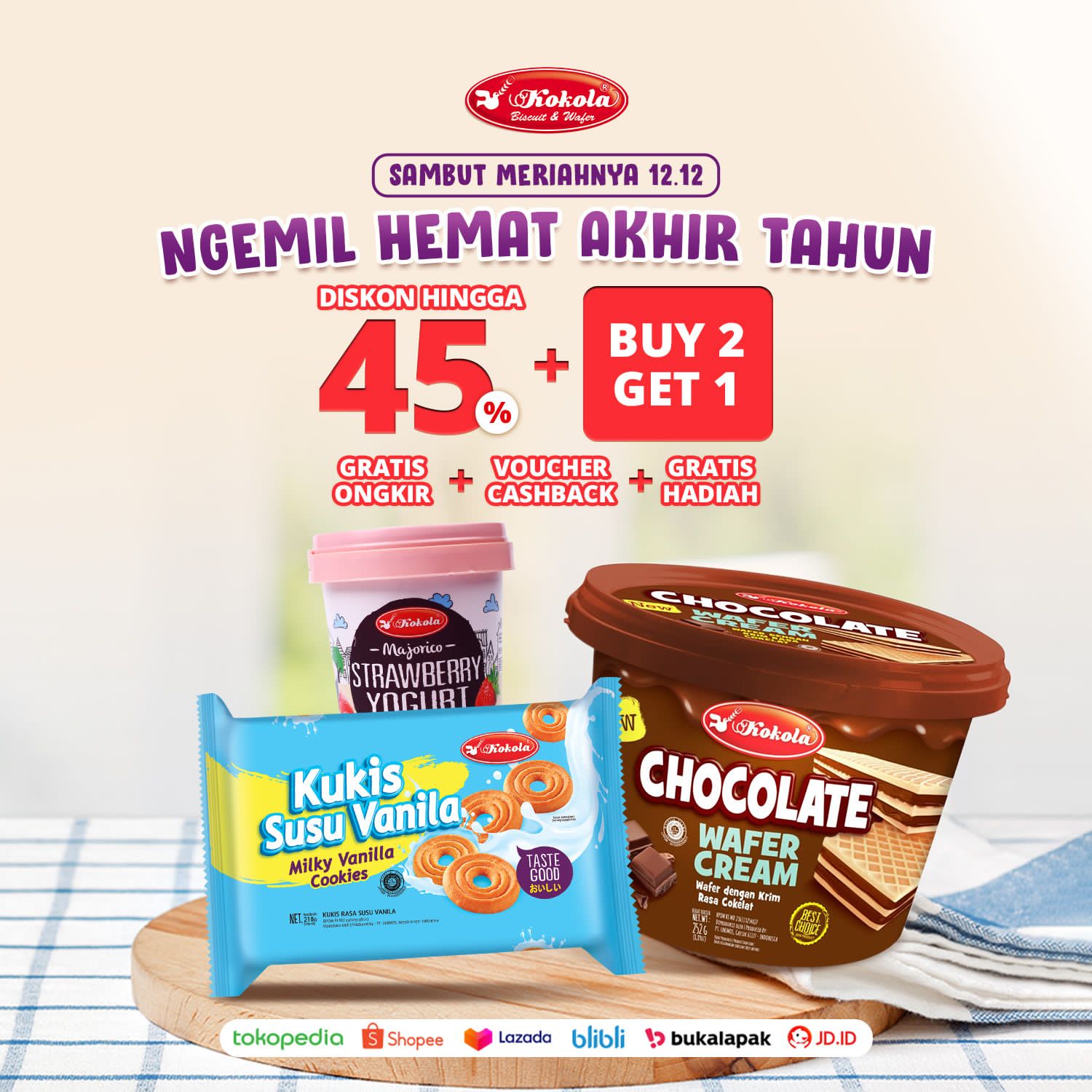 Di hari spesial promo 12.12 ini, Biskuit Kokola turut serta merayakan momen belanja online dengan mengeluarkan promo terbarunya, yakni promo diskon hingga 45% dan Buy 2 Get 1 khusus via e-commers.