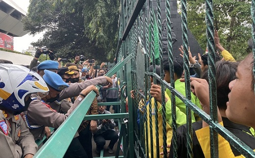 Dalam orasinya, mahasiswa mengatakan ingin masuk untuk membacakan tuntutannya, di mana salah satunya menolak kenaikan harga BBM.
