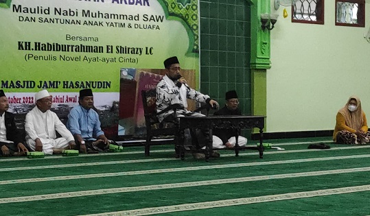 SEMARANG (Awal.id) – Masjid Jamii Hasanuddin menghadirkan sosok penulis novel religi islami KH Habiburrahman El Shirazy Lc atau Kang Abik dalam acara peringatan Maulid Nabi dan santunan yatim duafa, Kamis (13/10).