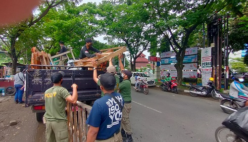 Dua membawa dua mobil operasi dan satu truk puluhan personel Satpol PP tiba di lokasi, pagi tadi. Petugas langsung membongkar dan mengangkuti lapak PKL yang berjejer di atas saluran air depan RSWN.