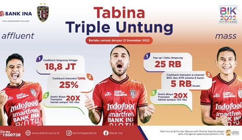 “Bank INA mampu menjadi solusi untuk kebutuhan semeton Bali United dalam bertransaksi. Hadirnya program unggulan Tabina Triple Untung pastinya memberikan kemudahan dan keuntungan yang menjanjikan untuk para nasabah. Semoga semeton Bali United yang belum memiliki rekening Bank INA bisa segera miliki untuk mendapatkan keuntungan yang akan terus dihadirkan,” jelas Yabes Tanuri dalam siaran persnya, Senin (7/11).