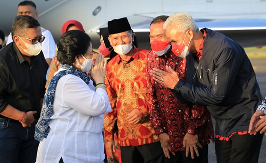 Ganjar yang mengenakan jaket warna gelap itu berada di barisan di antara sejumlah kader partai kepala banteng yang lain. Tidak ada obrolan khusus karena momen tersebut berlangsung singkat. Presiden RI ke-5 itu kemudian meninggalkan bandara menggunakan mobil Alphard warna hitam.