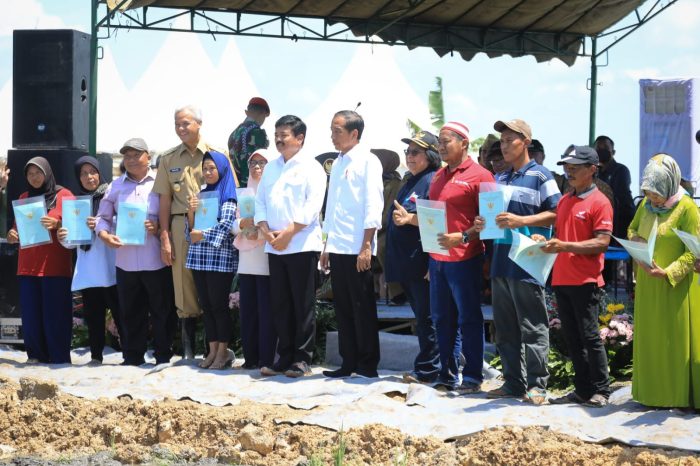 BLORA (Awal.id) – Presiden Joko Widodo, menyerahkan sertifikat tanah, surat keputusan (SK) Perhutanan Sosial dan SK Tanah Objek Reforma Agraria (TORA) di Desa Gabusan, Kabupaten Blora, Jumat (10/3).