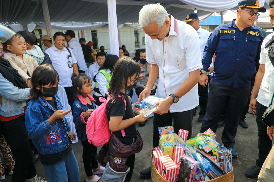 Ganjar di sela menyambut pemudik yang tiba di Pelabuhan Tanjung Emas Semarang, Minggu (16/4/2023). Total, ada 1.145 penumpang dan 479 unit sepeda motor yang diangkut oleh KM Dobonsolo dari Jakarta.