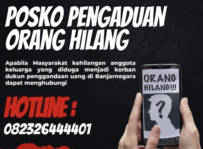 SEMARANG (Awal.id) – Polda Jateng membuka layanan hotline orang hilang pada masyarakat yang merasa kehilangan keluarga atau kerabatnya diduga menjadi korban dukun penggandaan uang di Banjarnegara.