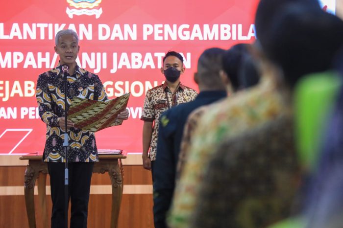 SEMARANG (Awal.id) – Gubernur Jawa Tengah, Ganjar Pranowo, melantik pejabat fungsional kesehatan, guru, dan teknis lainnya di lingkungan Pemerintah Provinsi Jawa Tengah. Pelantikan dilakukan di Gedung Gradhika Bhakti Praja, Rabu (12/4). Pejabat fungsional yang dilantik berjumlah 866 orang, terdiri atas 509 PNS dan 357 PPPK.