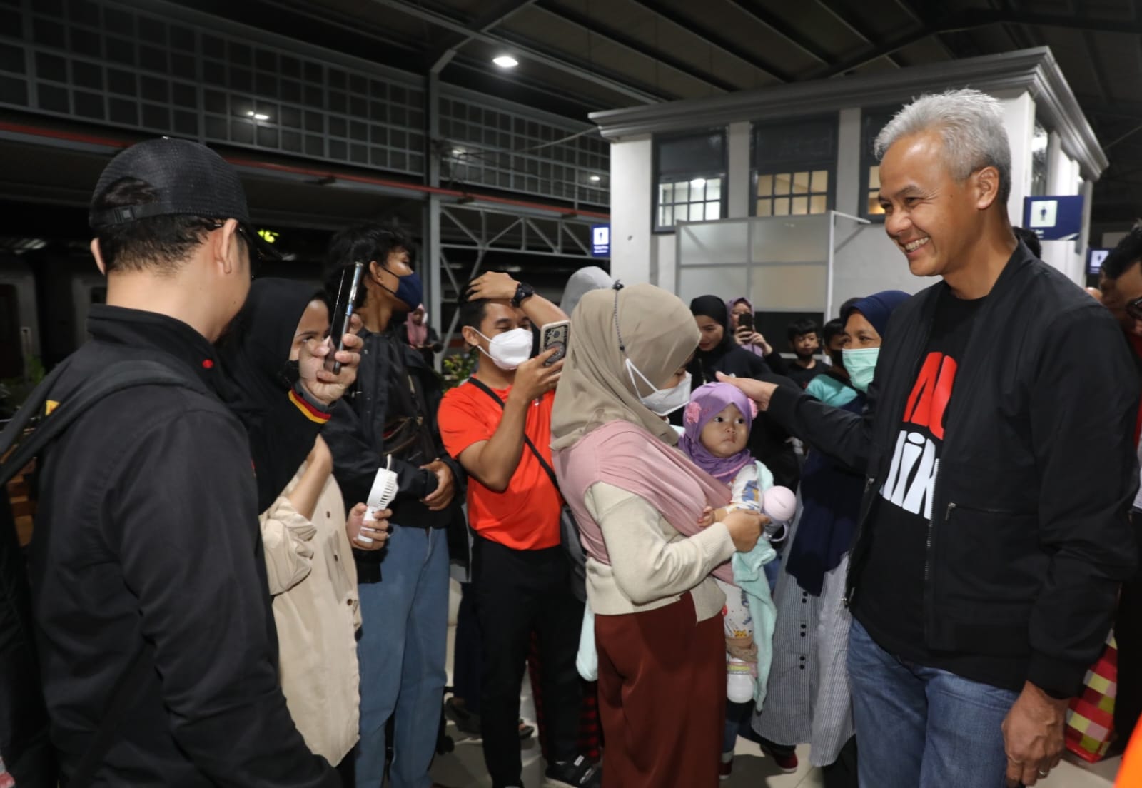 Ketika Ganjar tiba di stasiun, warga pun langsung mengerumuninya. Mereka tampak berdesakan untuk bersalaman dan meminta foto bersama Ganjar.