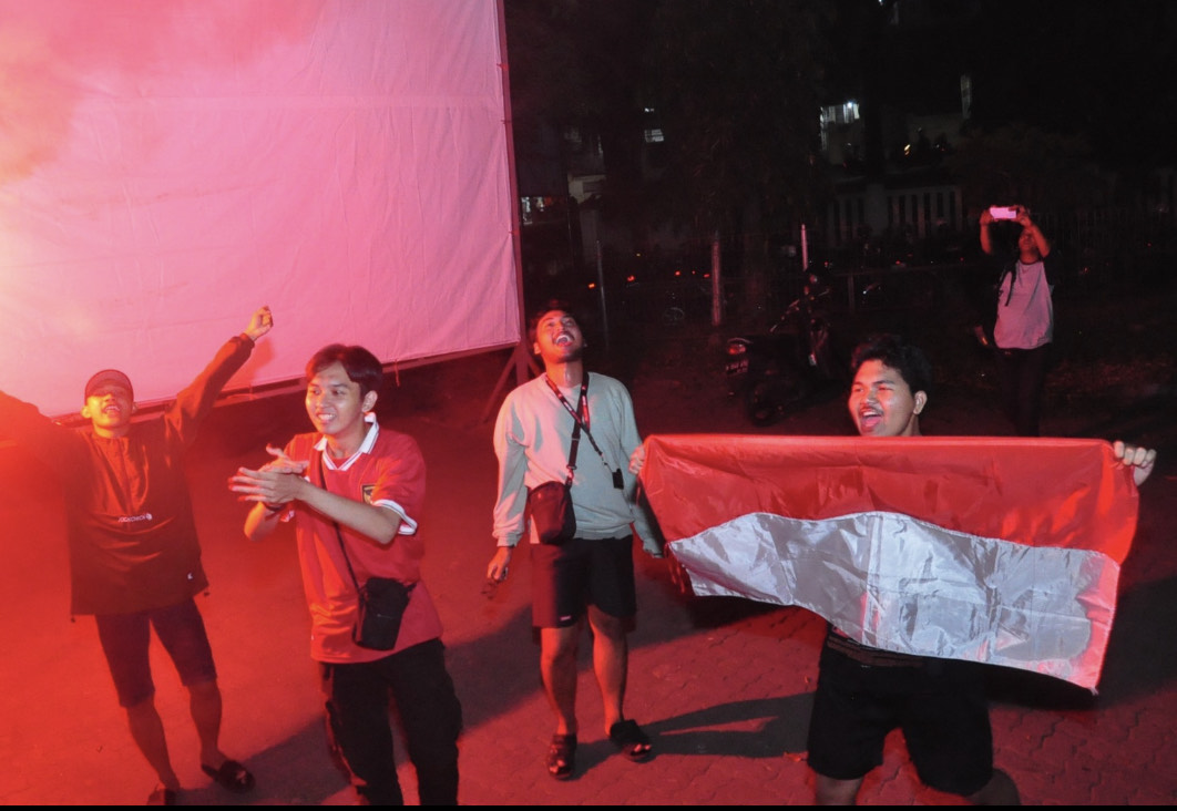Usai memastikan Timnas Garuda Muda berhasil menang, para penonton yang hadir di lokasi Angkringan Cuprit merayakan kemenangan tersebut bernyanyi dan menghidupkan flare.