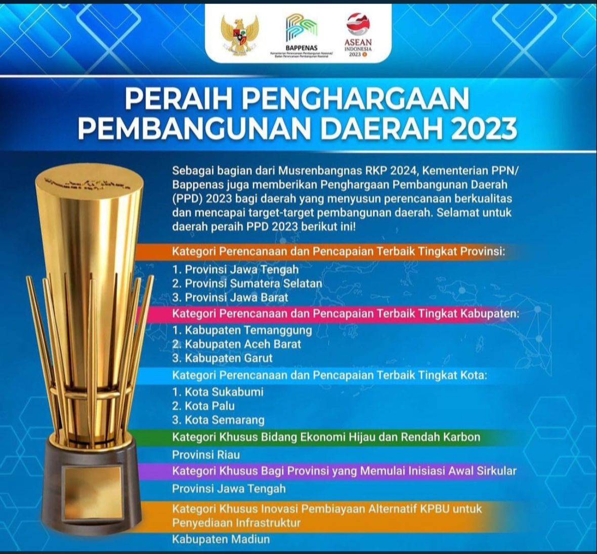 Penghargaan Pembangunan Daerah 2023 ini diberikan Bappenas dalam acara Indonesia Emas 2045 di JCC Senayan, Jakarta, Selasa (16/5/2023).