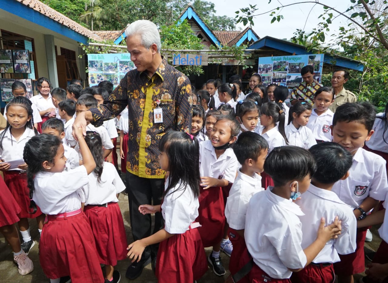 Ganjar datang disambut tarian Gugur Gunung yang sarat makna kegotongroyongan diiringi gamelan, serta tembang Bang Bang Wetan. Tarian untuk menyambut kedatangan Ganjar ini dibawakan dengan sukacita oleh para siswa kelas I hingga kelas VI yang berjumlah 66 siswa.