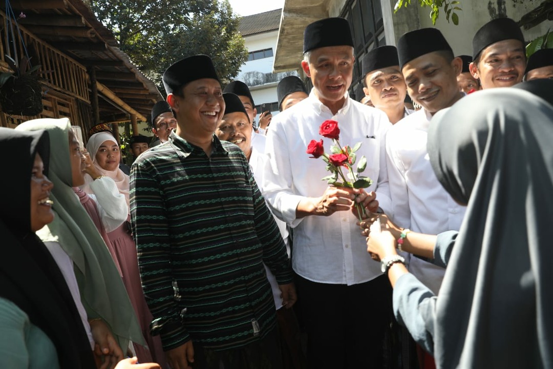 Begitu rombongan Ganjar tiba, para santri berebut menyalami Ganjar sambil memberikan mawar merah. Ganjar sampai kewalahan menerima mawar merah dari para santri itu.