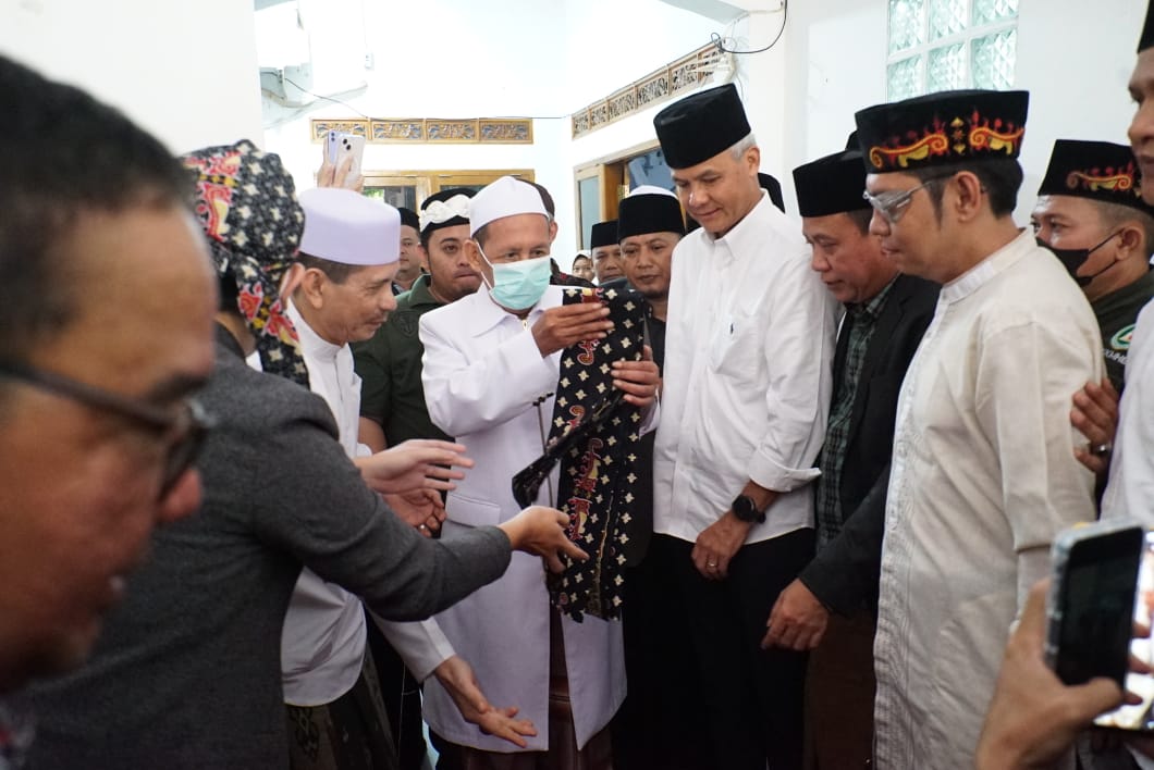 Bahkan ia sendiri yang memberikan kenangan istimewa pada Ganjar. Sebuah peci dan sorban hitam motif batik dipakaikan KH Tubagus Ahmad Syadzili Wasi pada Ganjar.