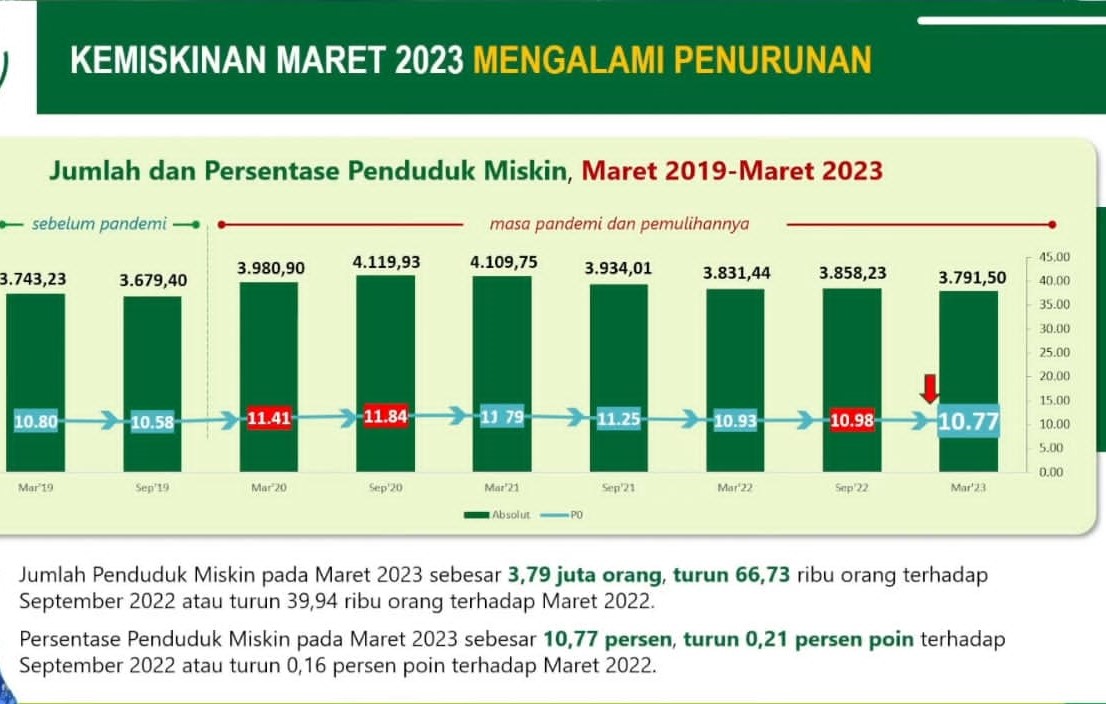 Secara presentase, jumlah ini mengalami penurunan menjadi 10,77 persen atau turun 0,21 persen poin bila dibanding September 2022 yang mencapai 10,98 persen atau 3,86 juta orang.