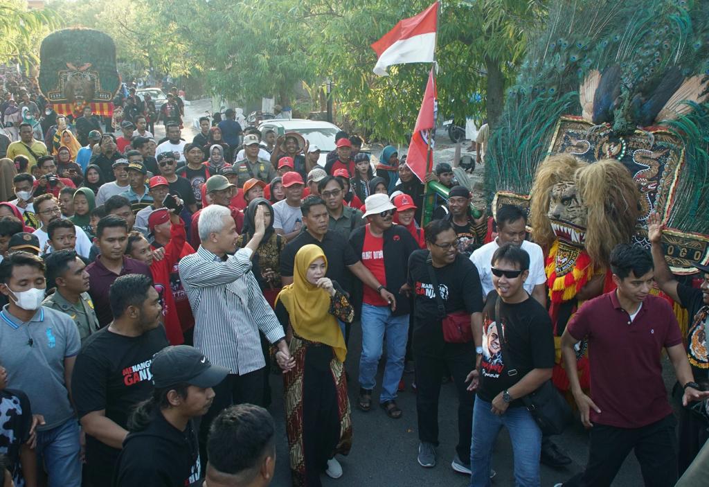 Mengenakan tali Warok di pinggang, Ganjar dan istri menari dengan senangnya. Keduanya mencoba mengikuti gerakan para penari itu sambil menyapa masyarakat.
