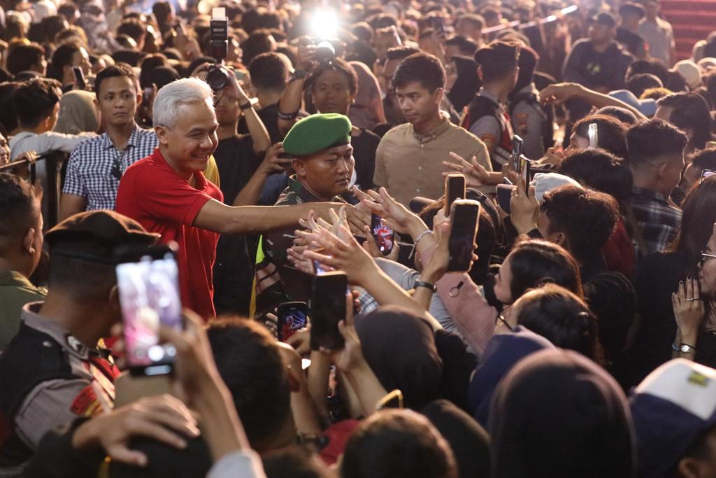 Ganjar juga sempat turun dari panggung untuk menyapa penonton. Ia memberikan sejumlah hadiah pada penonton yang berhasil menjawab pertanyaan darinya.