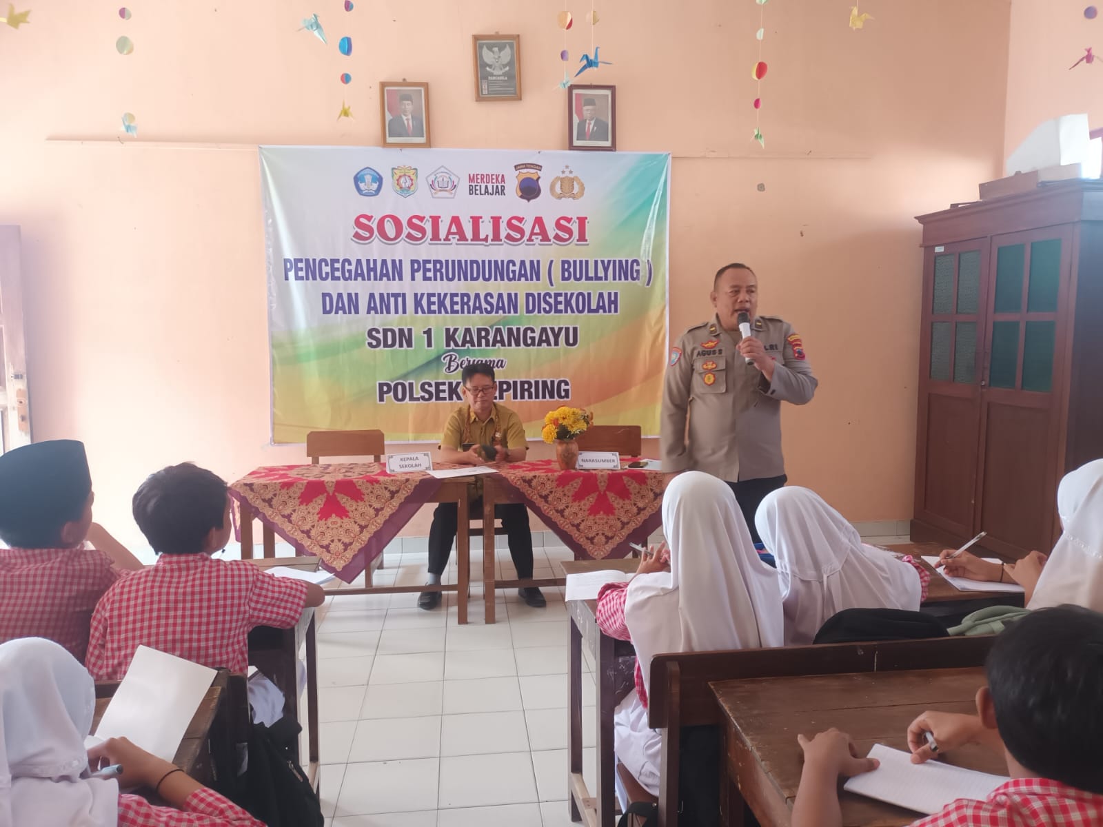 KENDAL (Awall.id) – Dalam rangka mencegah tindak kekerasan dan perundungan di lingkungan siswa, Polsek Cepiring melalui Kanit Binmas Ipda Agus Sutopo, S.H. dan Aipda Siti Sundari memberikan imbauan kepada siswa SDN 1 Karangayu Kec. Cepiring, Jumat (15/9/2023).