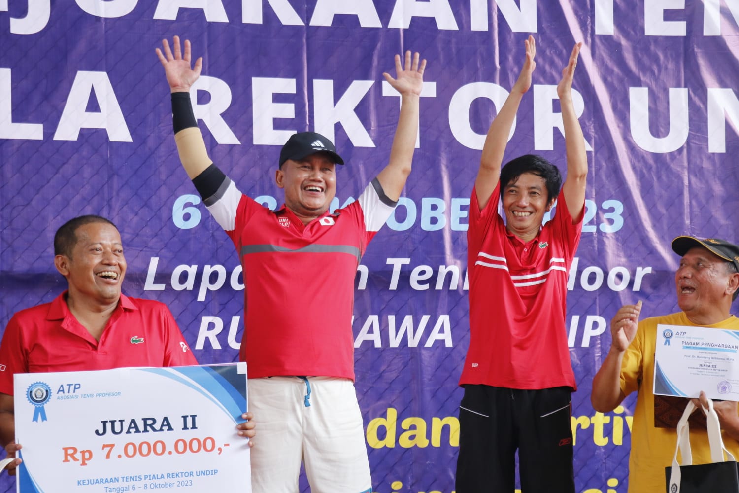 Sementara itu, tujuan diselenggarakannya turnamen Piala Rektor Undip adalah menumbuhkan rintisan kerjasama Tri Dharma Perguruan Tinggi antar perguruan tinggi, penyusunan format Pengabdian kepada Masyarakat oleh Perguruan Tinggi, sebagai forum silaturahmi dan mempererat tali persaudaraan antar profesor, serta meningkatkan derajat kesehatan para profesor,” tambah Prof. Heru. Prof. Dr. Suharnomo, S.E., M.Si., Dekan Fakultas Ekonomika dan Bisnis yang meraih juara kedua, mengucapkan terima kasih kepada semua profesor yang berpartisipasi dalam Kejuaraan Tenis Piala Rektor Undip. Ia berharap bahwa kompetisi ini akan semakin memperkuat sinergi dan semangat sportivitas, yang akan membantu masing-masing perguruan tinggi mencapai prestasi baik dalam bidang akademik maupun non-akademik.