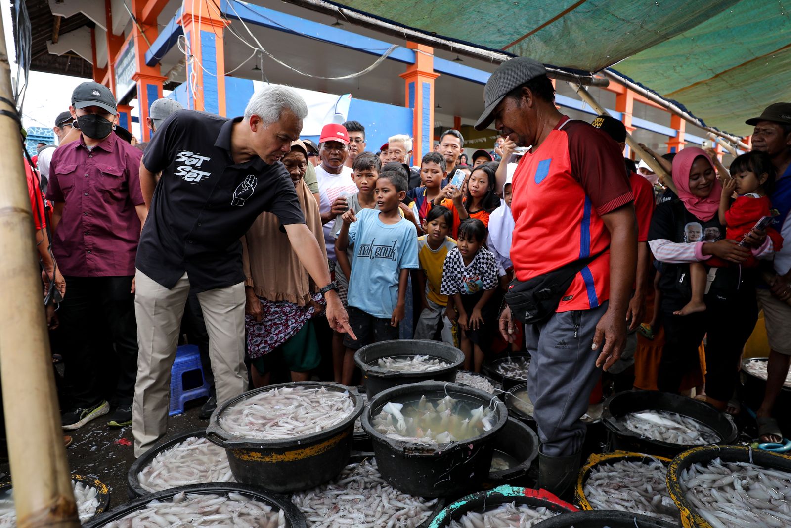 Meski berdesakan, mantan Gubernur Jawa Tengah itu tidak merasa terganggu. Ia bahkan dengan ramah dan senyum menyalami nelayan satu-per satu. Selanjutnya, Ganjar menyapa dan berdialog dengan nelayan untuk menyerap aspirasi. Bukan hanya itu, Ganjar juga berkeliling dan menemui lapak-lapak penjual ikan di sekitar TPI.