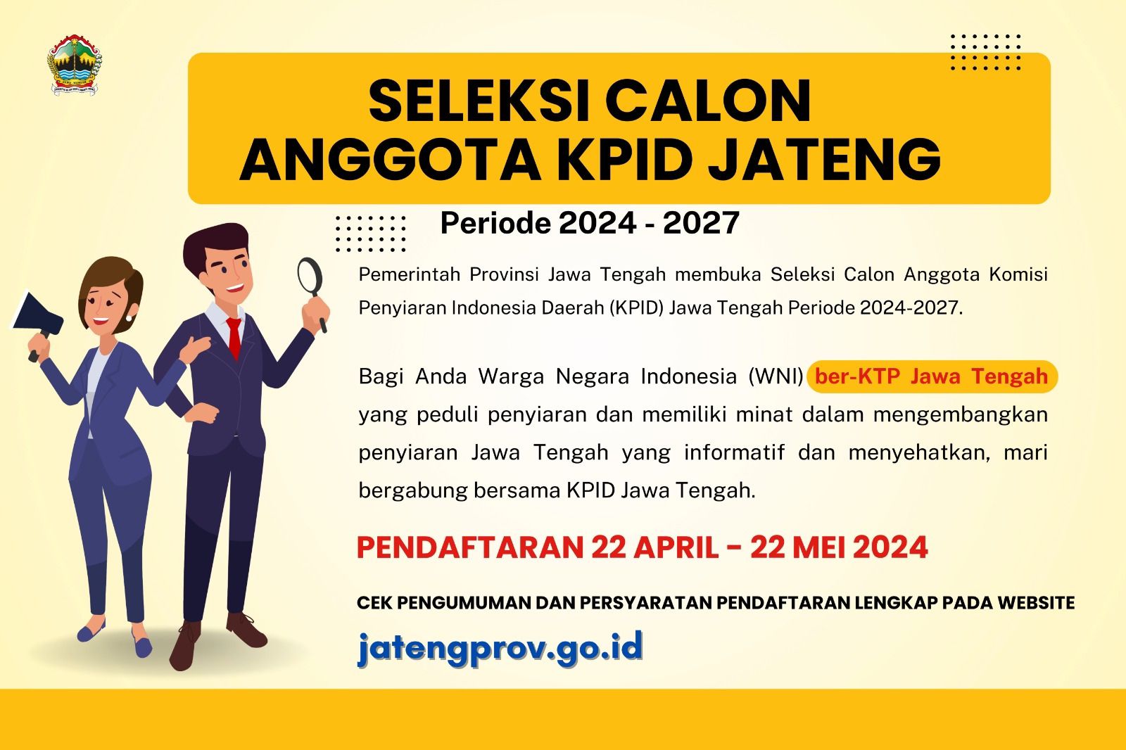 SEMARANG (Awall.id) – Pendaftaran Calon Anggota Komisi Penyiaran Indonesia Daerah (KPID) Provinsi Jawa Tengah Masa Jabatan Tahun 2024-2027, mulai dibuka Senin (22/4/2024). Masyarakat yang berminat dan memenuhi persyaratan, bisa mengirimkan berkas pendaftaran hingga 22 Mei 2024 pukul 14.00 WIB.