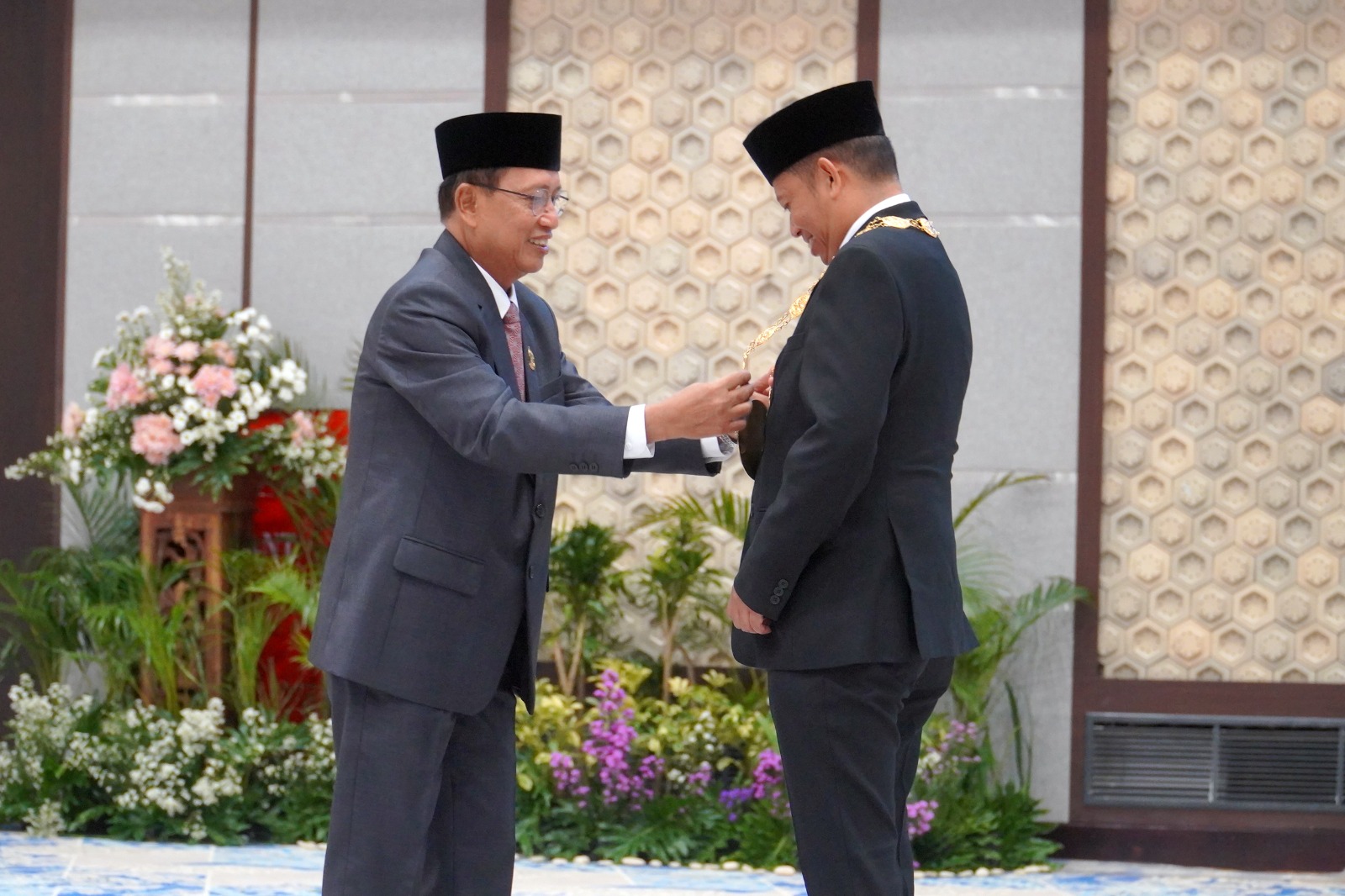 Ketua Majelis Wali Amanat (MWA) UNDIP Prof. Drs. H. Mohamad Nasir, Ak., M.Si., Ph.D. memberikan ucapan selamat kepada Prof. Dr. Suharnomo, S.E.,M.Si. yang sudah resmi dilantik menjadi Rektor UNDIP periode tahun 2024-2029.