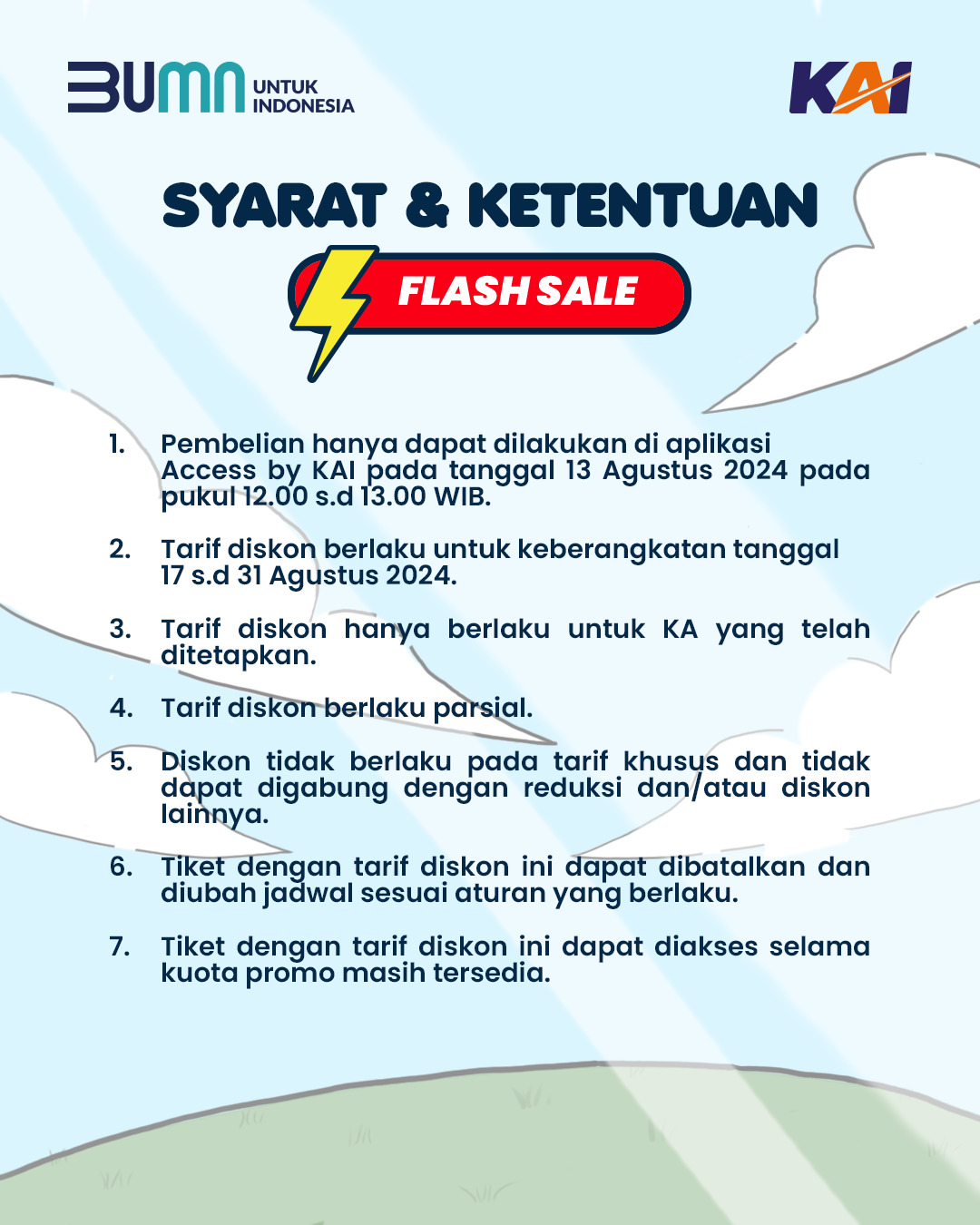 Sedangkan untuk program Promo Flash Sale dengan potongan harga 50% hanya berlaku untuk pembelian tanggal 13 Agustus 2024 pada pukul 12.00-13.00 WIB di aplikasi Access by KAI saat live Instagram @KAI121_.