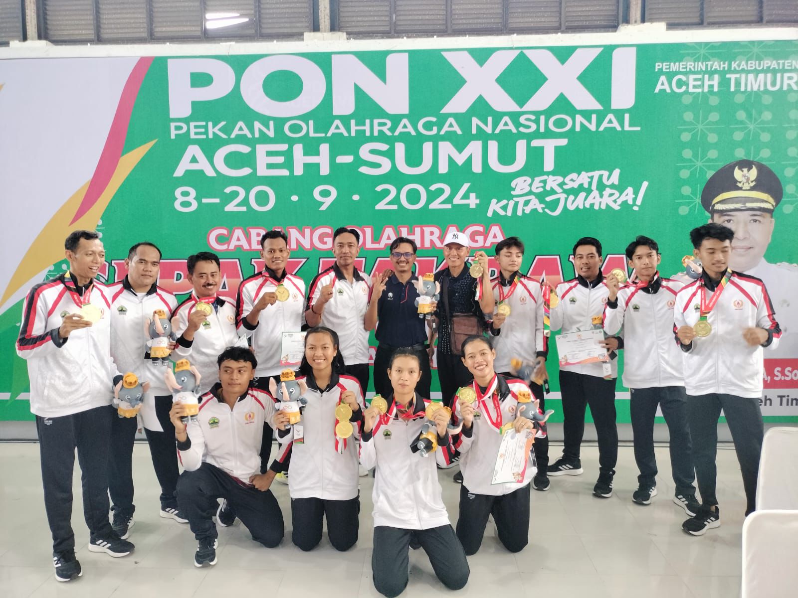 Dua medali emas diraih melalui nomor beregu putri dan beregu putra yang digelar di Gedung Idi Sport Centre Idi Kab Aceh Timur, Kamis (19/9/2024).
