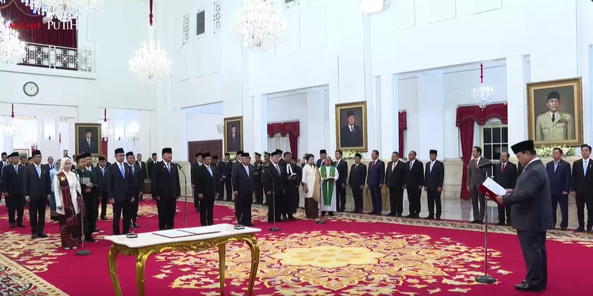 “Demi Allah saya bersumpah, bahwa saya akan setia kepada Undang-Undang Dasar Negara Republik Indonesia Tahun 1945 serta akan menjalankan segala peraturan perundang-undangan dengan selurus-lurusnya demi darma bakti saya kepada bangsa dan negara. Bahwa saya dalam menjalankan tugas jabatan akan menjunjung tinggi etika jabatan bekerja dengan sebaik-baiknya dengan penuh rasa tanggung jawab,” demikian bunyi sumpah jabatan di Istana Merdeka, Selasa (5/11/24).