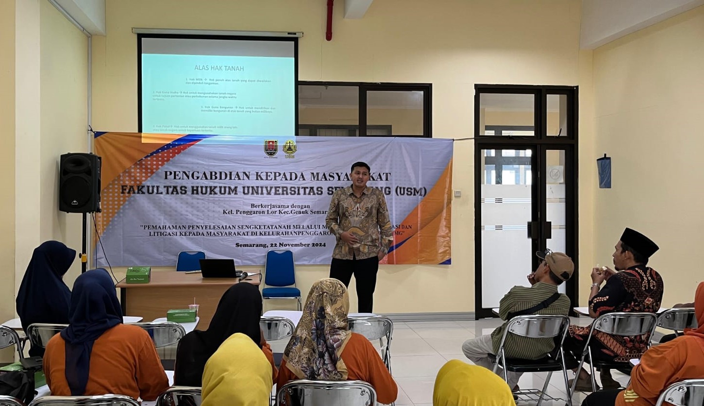 SEMARANG (Awall.id) – Dalam rangka menjalankan Tri Dharma Perguruan Tinggi, Tim Pengabdian kepada Masyarakat dosen Fakultas Hukum Universitas Semarang (USM) melakukan Sosialisasi Pemahaman Penyelesaian Sengketa Tanah Melalui Mekanisme Non Litigasi dan Litigasi kepada Masyarakat Kelurahan Penggaron Lor Kota Semarang, pada 22 November 2024 di Universitas Semarang.