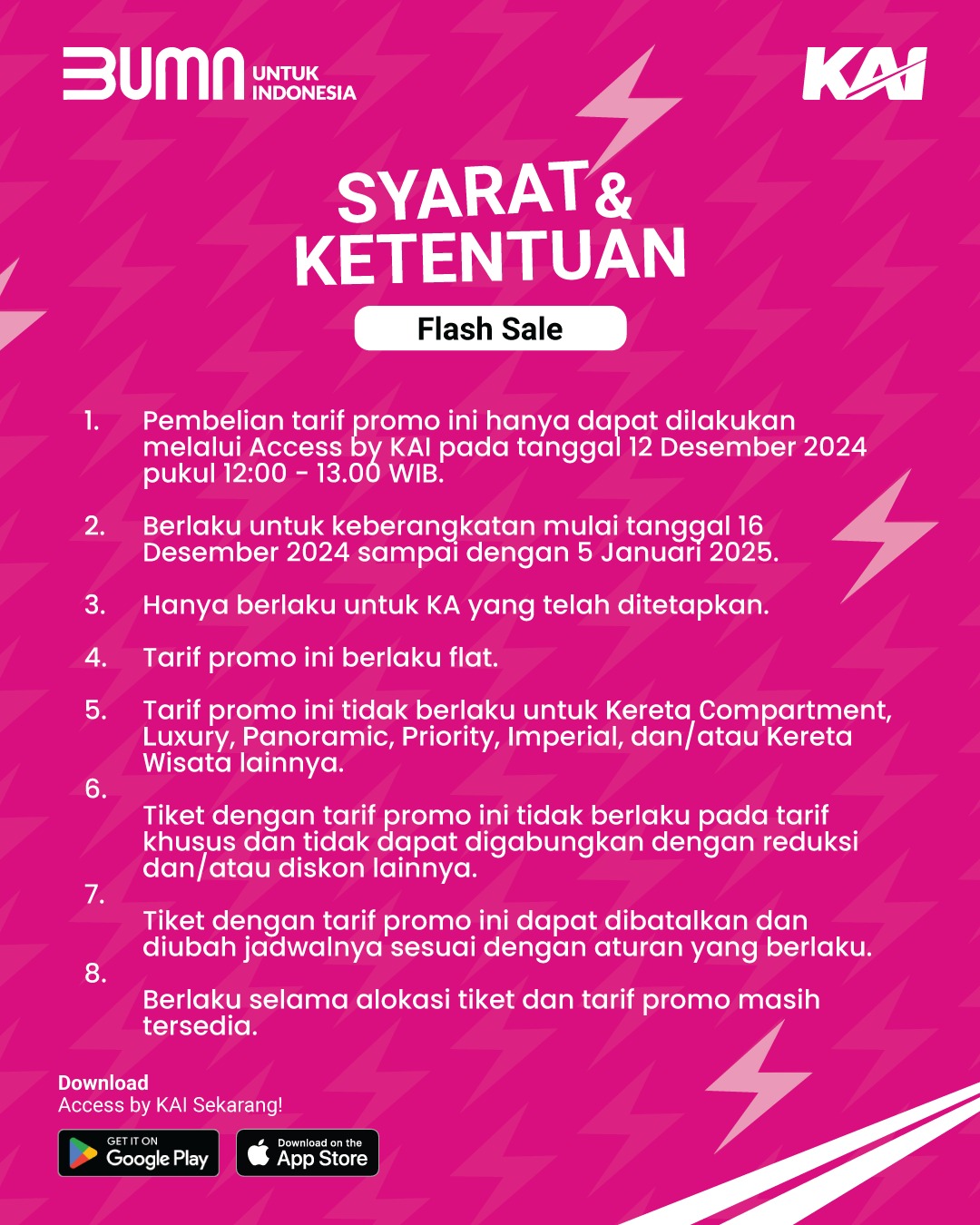 1. Pembelian tarif promo ini hanya dapat dilakukan melalui Access by KAI pada tanggal 12 Desember 2024 pukul 12:00-13.00 WIB.