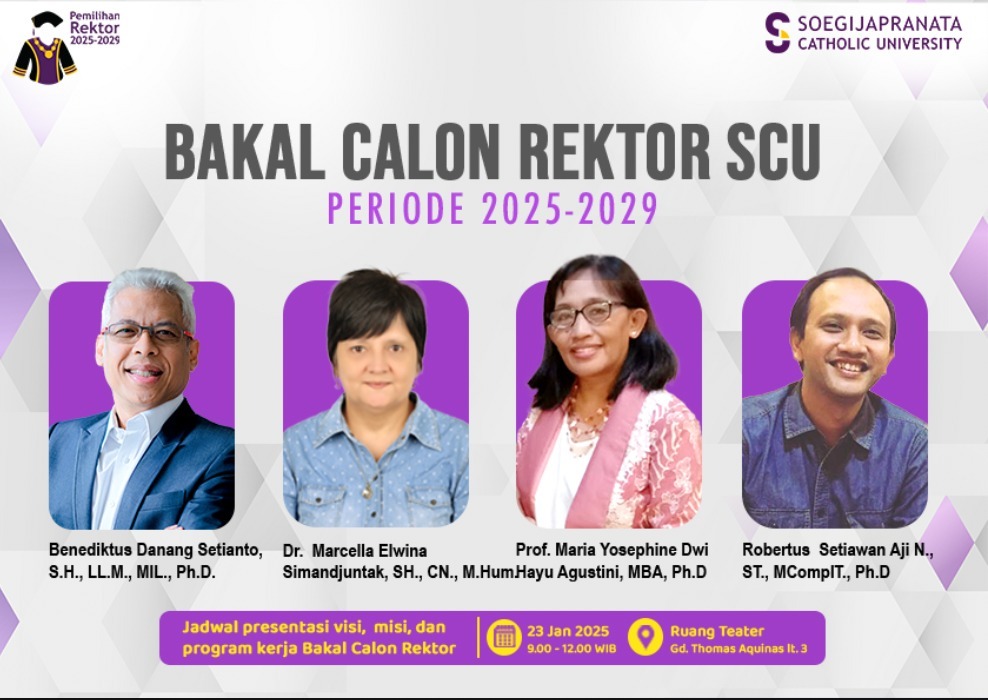 SEMARANG (Awall.id) – Soegijapranata Catholic University (SCU) sedang dalam proses Pemilihan Rektor (Pilrek) masa jabatan 2025 – 2029. Menurut keterangan Rektor SCU Dr. Ferdinandus Hindiarto, bahwa proses Pilrek telah dimulai sejak bulan Oktober 2024.