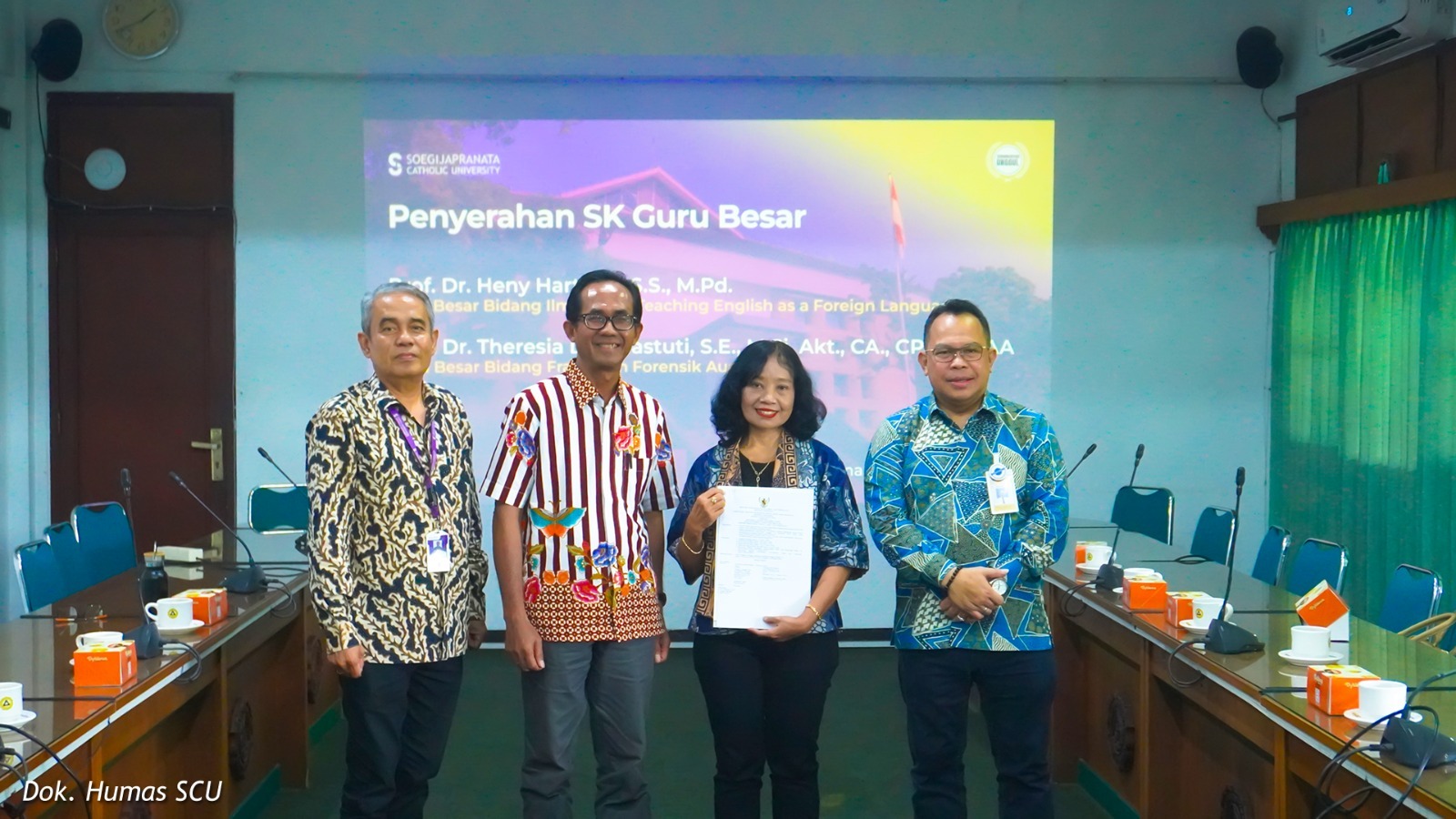 SEMARANG (Awall.id) – Soegijapranata Catholic University (SCU) menerima 2 Surat Keputusan (SK) Guru Besar atas nama Dosen Fakultas Bahasa dan Seni (FBS) Prof. Dr. Heny Hartono, S.S, M.Pd (Bidang Ilmu Teaching English as a Foreign Language atau TEFL) dan Dosen Fakultas Ekonomi dan Bisnis (FEB) Prof. Dr. Theresia Dwi Hastuti, S.E, M.Si, Akt., CA., CPA., CGAA (Bidang Fraud dan Forensik Audit).