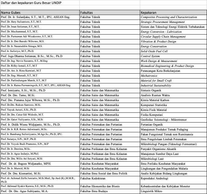 Para Guru Besar yang dikukuhkan berasal dari berbagai fakultas dengan rincian: 15 Guru Besar dari Fakultas Teknik, 7 dari Fakultas Sains dan Matematika, 5 dari Fakultas Peternakan dan Pertanian, 3 dari Fakultas Perikanan dan Ilmu Kelautan, 2 dari Fakultas Kesehatan Masyarakat, serta masing-masing 1 Guru Besar dari Fakultas Sosial dan Ilmu Politik (FISIP), Fakultas Ekonomika dan Bisnis, Fakultas Kedokteran, dan Fakultas Ilmu Budaya.