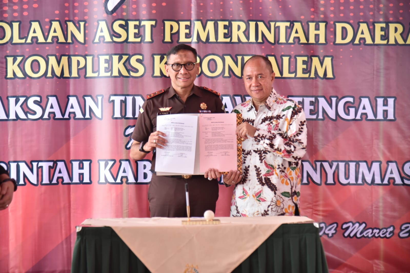 Penyerahan aset ini dilakukan Kepala Kejaksaan Tinggi Jawa Tengah, Dr. H. Ponco Hartanto, SH, MH., kepada Bupati Banyumas, Drs. H. Sadewo Tri Lastiono, MM., dihadiri Asisten Tindak Pidana Khusus (Aspidus) Dr. Lukas Alexander Sinuraya,SH, MH di Kantor Kejaksaan Negeri (Kejari) Purwokerto, Selasa (4/3).
