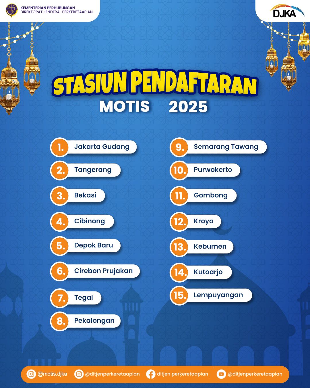 Informasi lebih lanjut dapat diakses melalui akun Instagram resmi DJKA, yaitu @ditjenperkeretaapian dan @motis.djka.