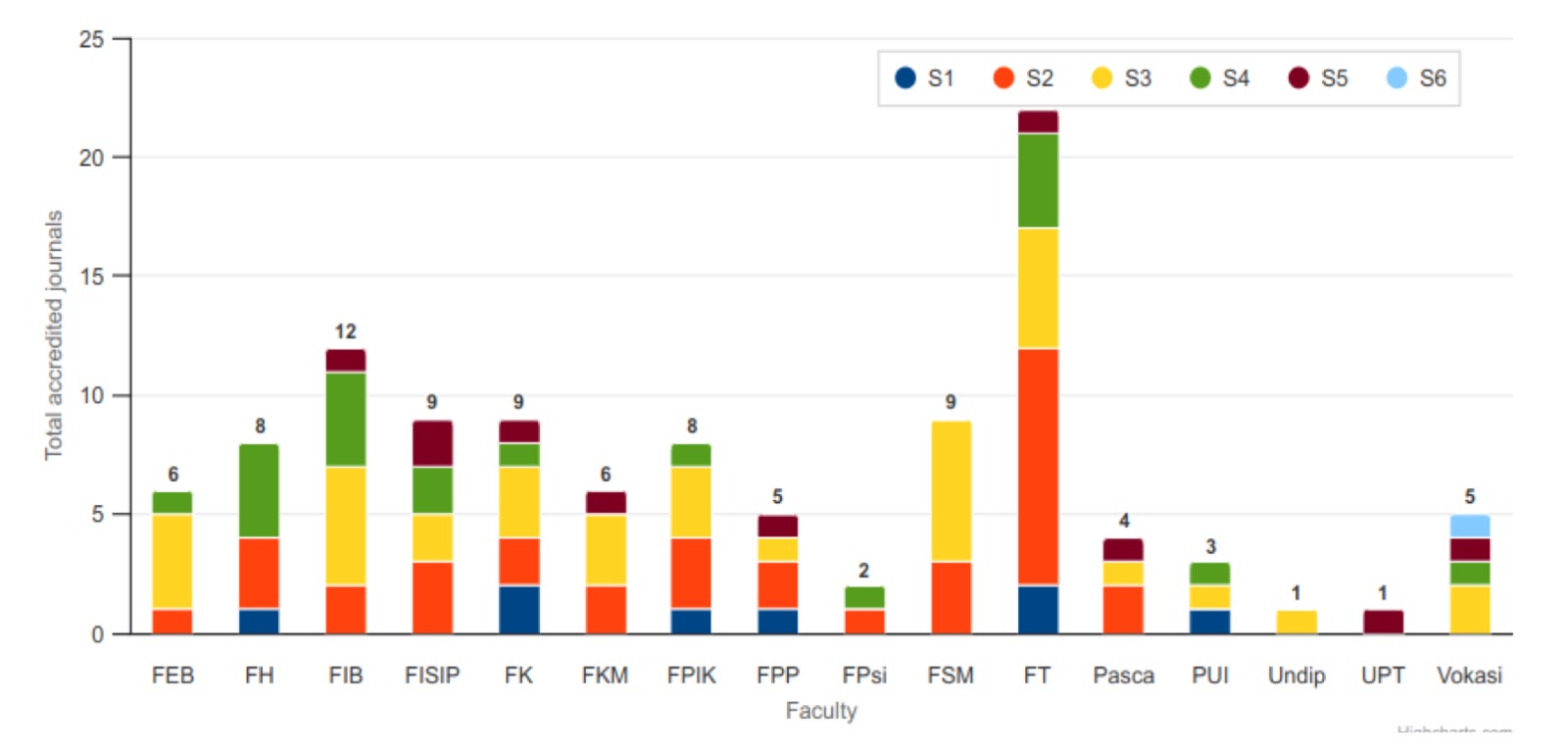 Berdasarkan peringkatnya, delapan jurnal terakreditasi S1, 34 jurnal S2, 37 jurnal S3, 20 jurnal S4, 10 jurnal S5, dan 6 jurnal S6.