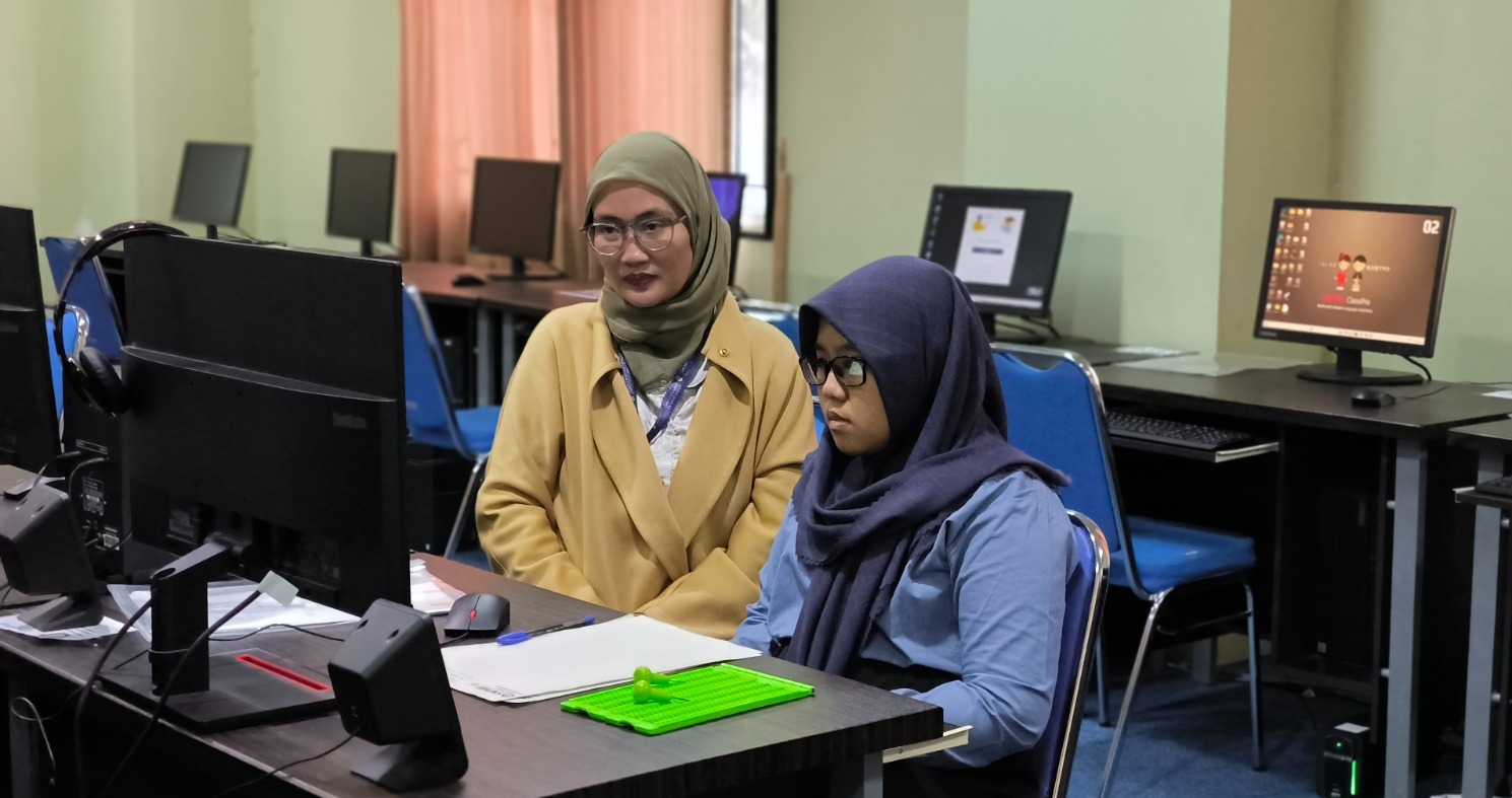 Dalam mengikuti ujian, peserta disabilitas dengan kondisi tuna netra didampingi oleh pengawas yang terlatih dan fasilitas pendukung yang disesuaikan dengan kondisi peserta.