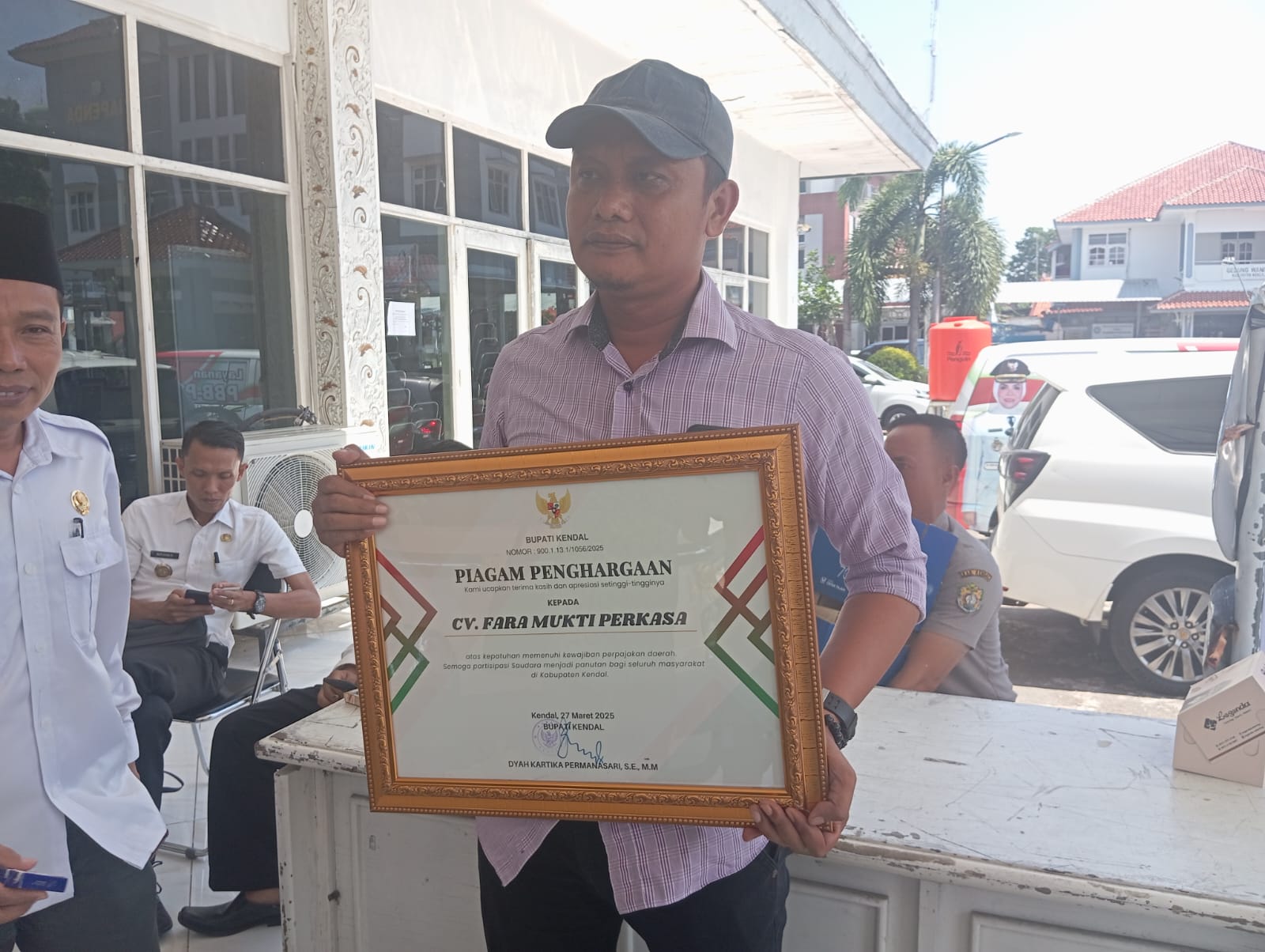 KENDAL (Awall.id) – CV Fara Mukti Perkasa yang merupakan perusahaan pertambangan yang dimiliki oleh Fatkhurohim, warga Jatirejo, Ngampel, Kabupaten Kendal, menerima piagam penghargaan dari Bupati Kendal atas kontribusinya dalam membayar pajak.