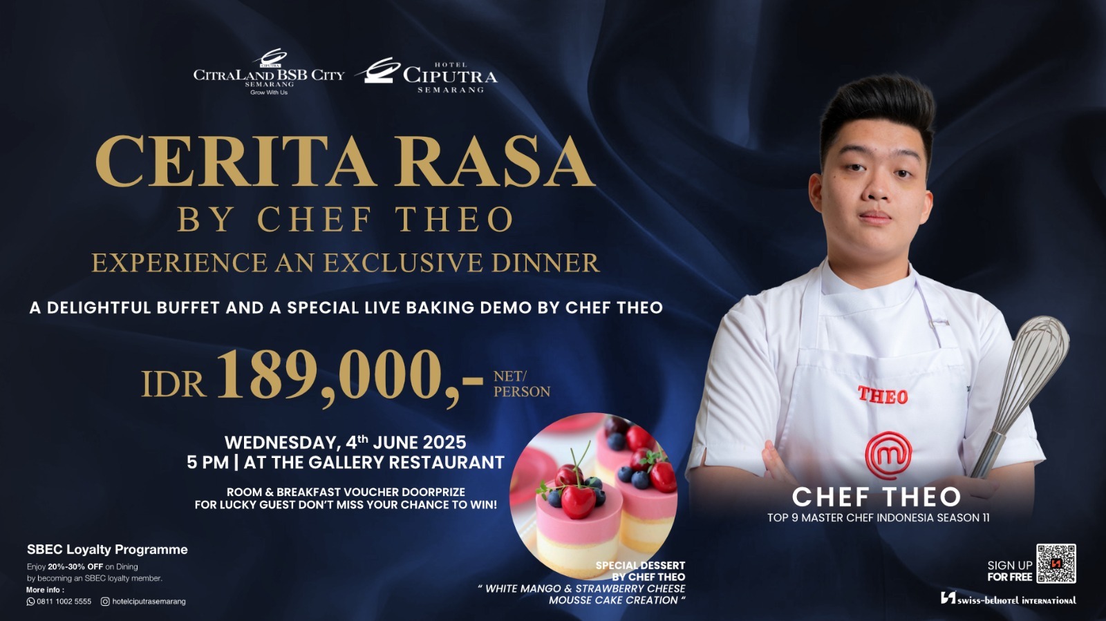 SEMARANG (Awall.id) – Hotel Ciputra Semarang, hotel bintang lima bertaraf internasional yang terletak di pusat kota Semarang dengan bangga mempersembahkan acara kuliner eksklusif bertajuk “Cerita Rasa by Chef Theo” yang akan digelar pada hari Rabu, 4 Juni 2025 mulai pukul 17.00 WIB di The Gallery Restaurant.