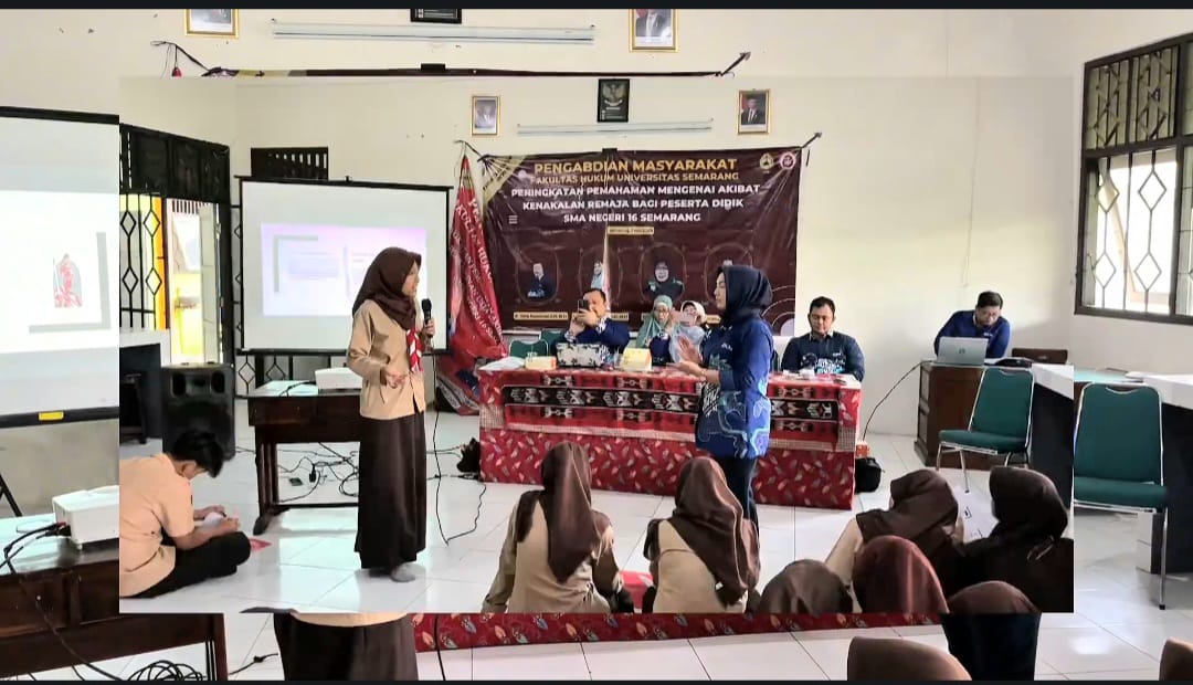 SEMARANG (Awall.id) – Tim Pengabdian Kepada Masyarakat Universitas Semarang yang terdiri atas dosen Fakultas Hukum, memberikan penyuluhan dengan tema ”Peningkatan Pemahaman Mengenai Akibat Kenakalan Remaja bagi Peserta Didik SMA Negeri 16 Semarang”, pada 2 Mei 2025.