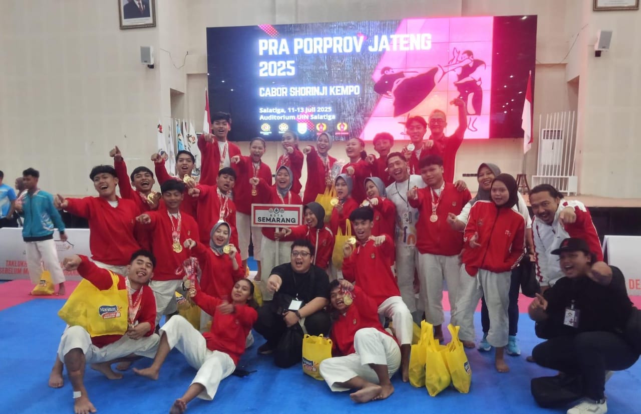 SALATIGA (Awall.id) – Tim Shorinji Kempo Kota Semarang meraih 9 emas, 3 perak, dan 2 perunggu. Hasil ini mengantar Ibu Kota Jateng sebagai juara umum pada babak kualifikasi Porprov Jateng XVII yang berlangsung di Auditorium UIN Salatiga, Minggu (13/7/2025).