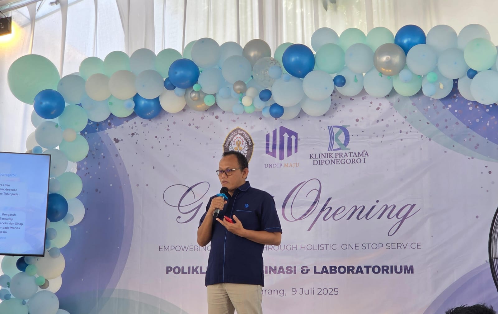 Penanggung Jawab Klinik Pratama Diponegoro 1, Dr. dr. Sutopo Patria Jati, M.M., M.Kes., dalam sambutannya menjelaskan bahwa layanan utama yang ditawarkan meliputi vaksinasi, imunisasi, serta pemeriksaan laboratorium klinik.