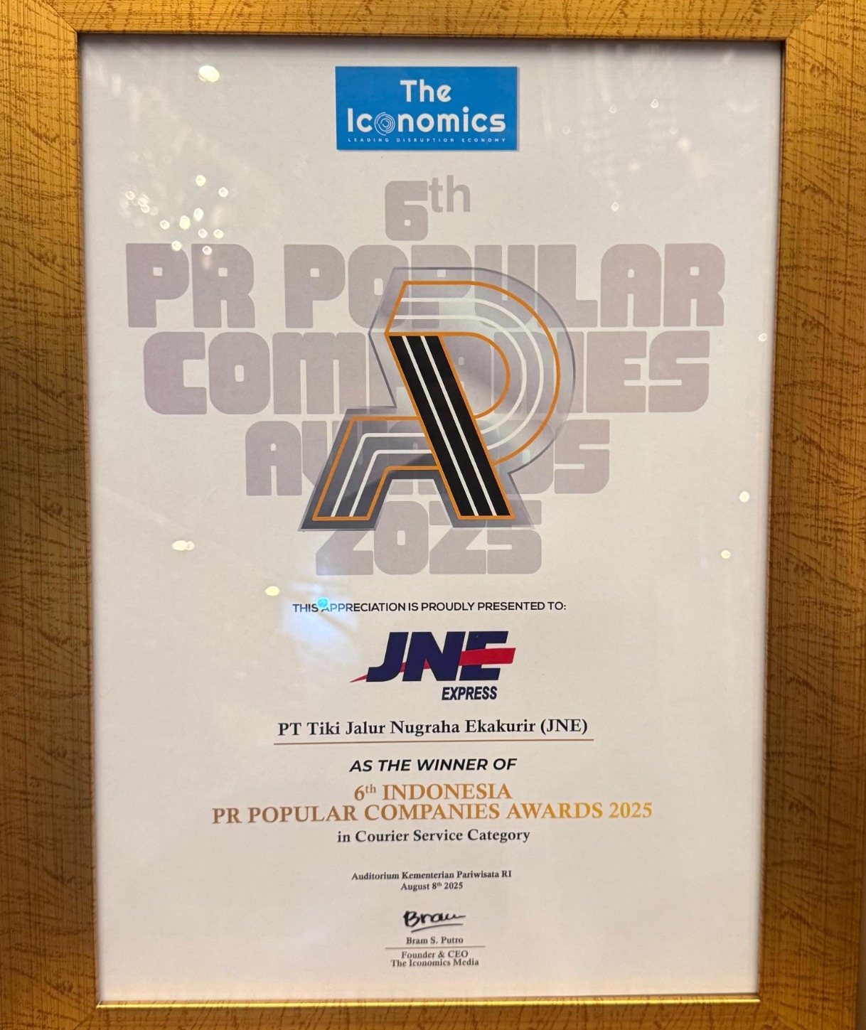 JNE berhasil meraih PR Popular Companies Awards 2025, yang menegaskan tingginya popularitas JNE di mata publik berkat konsistensi dalam komunikasi korporat dan kedekatan dengan pelanggan, serta PR Persons Awards 2025 yang dianugerahkan kepada Eri Palgunadi, SVP Marketing Group Head JNE, atas kontribusinya yang luar biasa dalam membangun reputasi positif perusahaan melalui strategi komunikasi yang inovatif, humanis, dan berdampak luas.