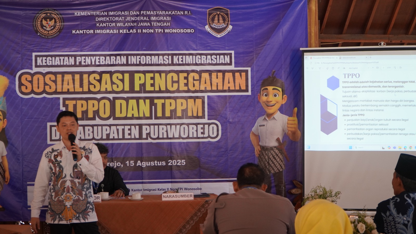 ” Kabupaten Purworejo memiliki potensi pergerakan orang yang cukup tinggi sehingga menuntut kewaspadaan kita semua agar tidak ada warga yang menjadi korban atau bahkan terlibat dalam jaringan pelaku. Melalui peran Petugas Imigrasi Pembina Desa (PIMPASA) dan program Desa Binaan Imigrasi, kami berkomitmen membina, memberikan edukasi, dan menjadi garda terdepan dalam mendeteksi potensi kerentanan warga terhadap TPPO dan TPPM,” ujar Imam Bahri.