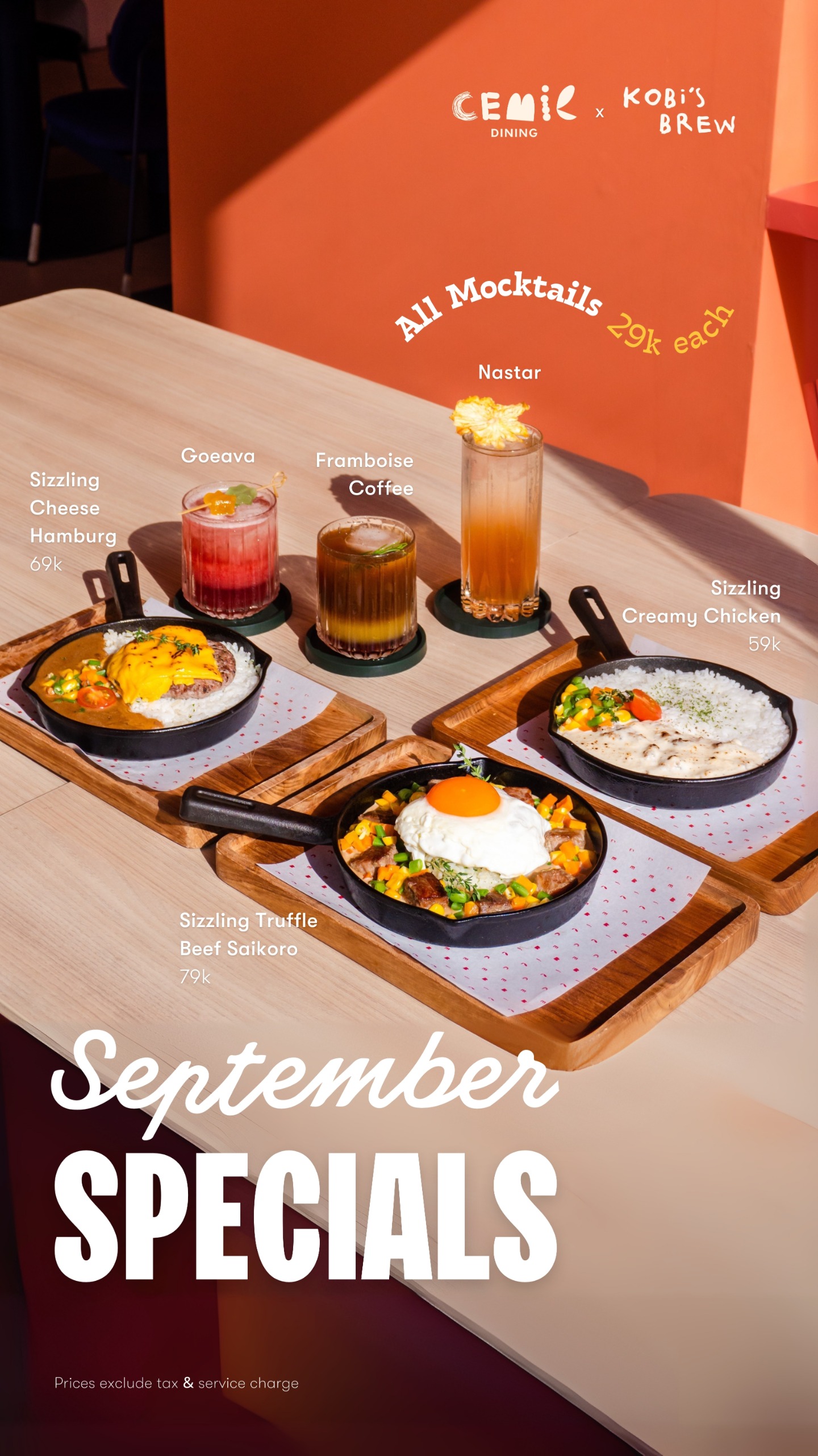 Program ini dirancang sebagai bagian dari penyegaran menu musiman, dengan menghadirkan beragam pilihan makanan dan minuman bernuansa modern. Tamu dapat menikmati sizzling menu khas Cemil Dining yang disajikan di atas hot plate, seperti Sizzling Truffle Beef Saikoro (Rp79.000), Sizzling Cheese Hamburg (Rp69.000), dan Sizzling Creamy Chicken (Rp59.000). Sementara itu, Kobi’s Brew menawarkan tiga varian mocktail segar—Goeava, Framboise Coffee, dan Nastar—dengan harga Rp29.000 per gelas.