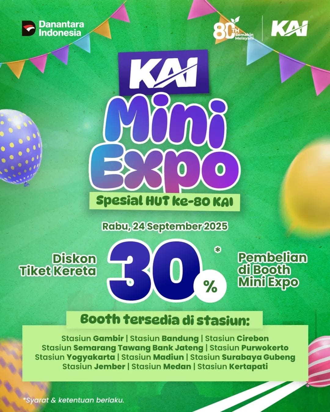 “Delapan puluh tahun adalah perjalanan panjang penuh dinamika, tetapi semangat KAI tetap sama yaitu melayani. Mari rayakan HUT ke-80 bersama kami, dan pantau seluruh promo spesial ini di Access by KAI sesuai jadwal dan ketentuan untuk perjalanan yang semakin berkesan,” tutup Franoto.