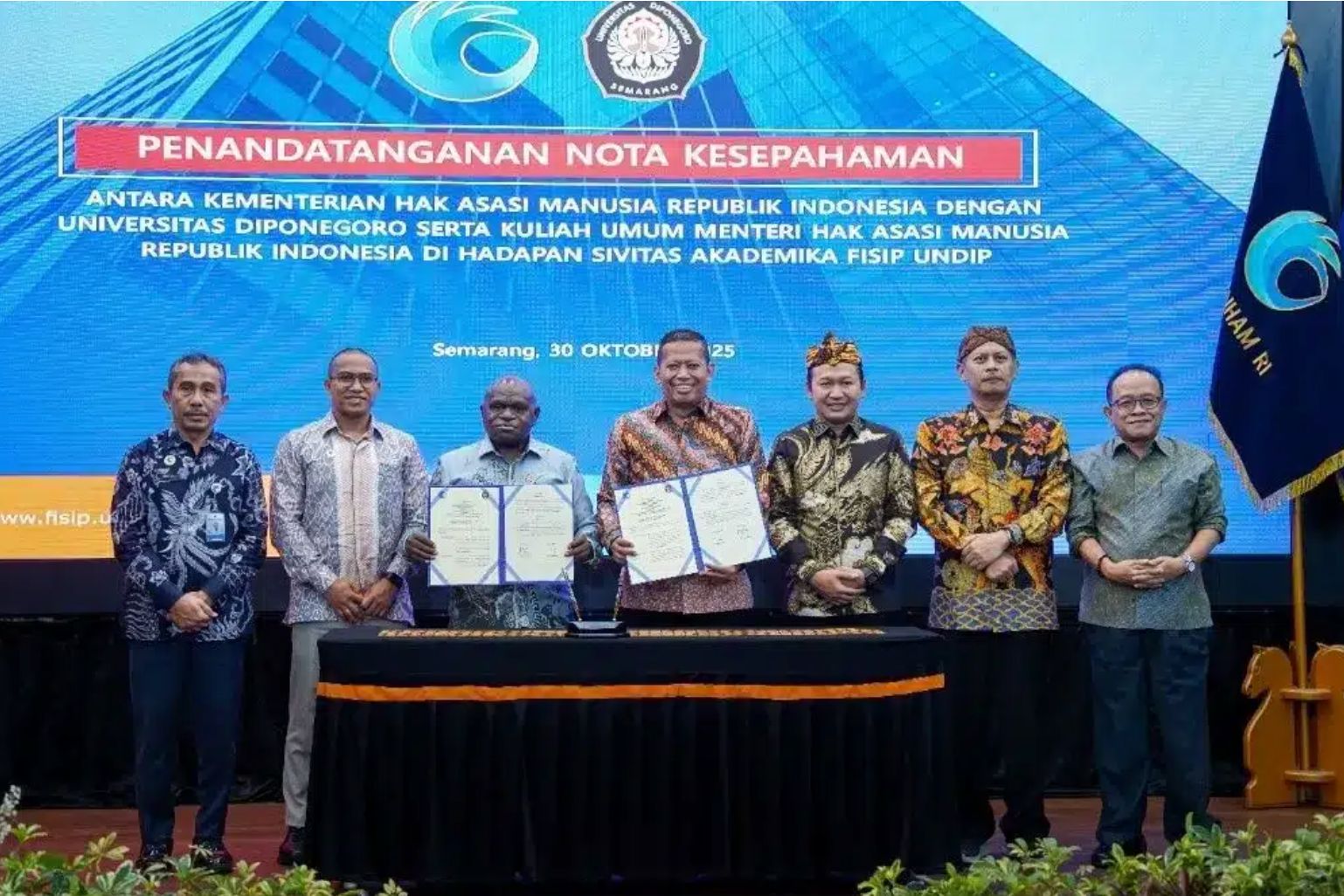 Dalam kesempatan tersebut, turut dilakukan penandatanganan Nota Kesepahaman antara UNDIP oleh Rektor UNDIP Prof. Dr. Suharnomo, S.E., M.Si. dan Kementerian HAM RI, Menteri Natalius Pigai tentang kerja sama di bidang pendidikan, penelitian, dan pengabdian kepada masyarakat, khususnya dalam pengarusutamaan HAM di perguruan tinggi. Inisiatif ini diprakarsai oleh Program Studi S1 Administrasi Bisnis FISIP UNDIP, dengan dukungan Direktorat Inovasi, Hilirisasi, dan Kerja Sama UNDIP.