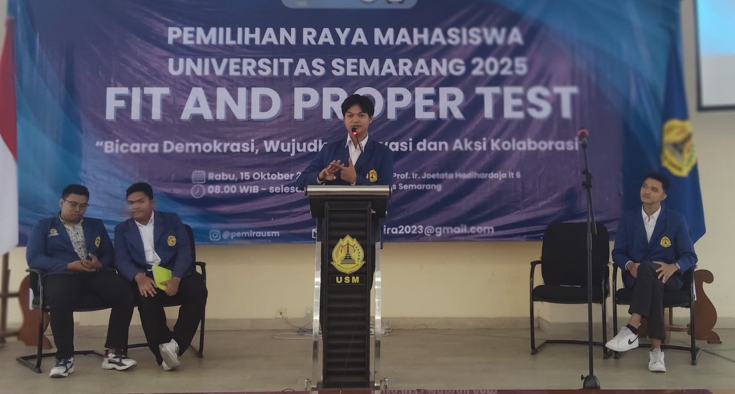 SEMARANG (Awall.id) – Pemilihan Raya Mahasiswa (Pemira) Universitas Semarang (USM) 2025 resmi memasuki tahapan Fit and Proper Test yang diselenggarakan oleh Komisi Pemilihan Raya Mahasiswa (KPRM) pada 15 Oktober 2025 di Gedung V Prof Ir Joetata Hadihardaja lantai 6.